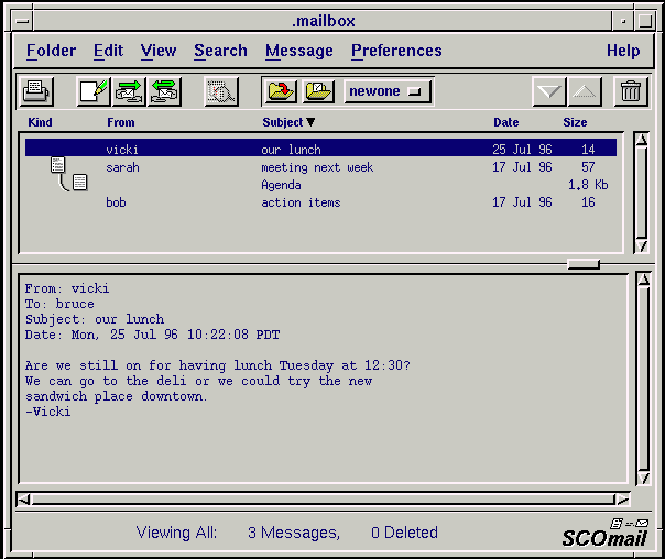Each line in the message list describes a message: who sent it, what it is about (the subject), when it was sent, and how big it is. Some messages have additional graphical information under the ``Kind'' heading. For example, you might see that you have not yet read a message, or that you have already replied to or saved it.
