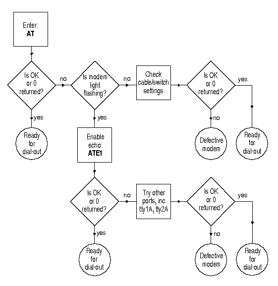 If the terminal does not echo the OK message when it is connected to the new port, check your cable again. You can also connect a terminal to the port (with a proper terminal cable) and verify that the port works. If the modem returns garbage, then try connecting at different speeds; some modems can be set to communicate at the DTE connect speed, while others communicate at a fixed speed. If the modem still does not respond properly, the modem may be defective.