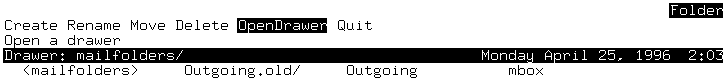 Select OpenDrawer, and pick the drawer you want to see, (for example Outgoing.old); its contents appear on the screen and the divider line displays its name: