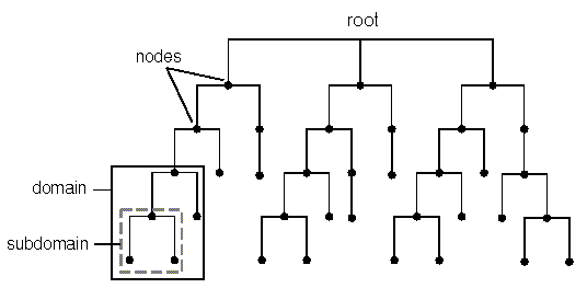 Under DNS, the network consists of a hierarchy of domains. This hierarchy, referred to as the domain name space, is organized as an inverted tree radiating from a single root, much like the UNIX filesystem: