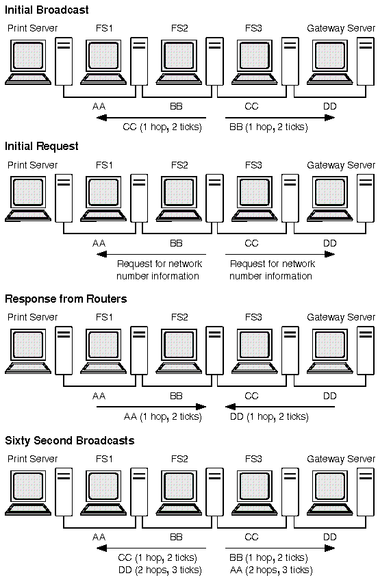 On a network, routers are constantly exchanging information with each other to make sure that their routing information tables reflect up-to-the-minute changes in the layout of the network. To accomplish this, routers transmit a series of broadcasts from the time they come up until they are brought down. Routing information broadcasts can be classified by the time at which they occur: