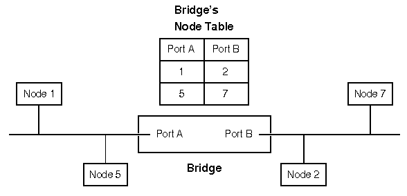After examining the packets transmitted on both segments, the bridge creates a table that tracks which nodes exist on each segment. With this table, the bridge can filter unnecessary traffic. For instance, if node 1 sends a packet to node 5, the bridge will not retransmit that packet on its port B. It will, however, retransmit packets sent from node 1 to node 7. Like repeaters, transparent bridges -- as their name implies -- are transparent to the sending and receiving nodes.