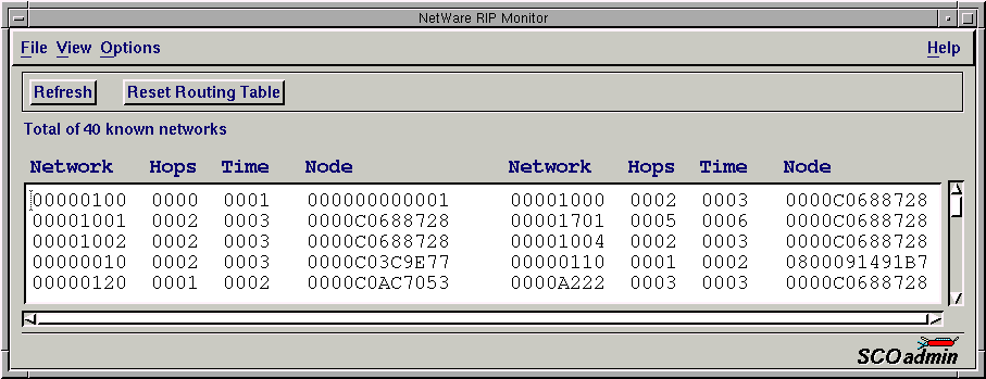 This information reflects the knowledge that a given SCO OpenServer system has gathered from its own configuration file as well as other nodes on the network. It presents a snapshot of the current operation of the internetwork.