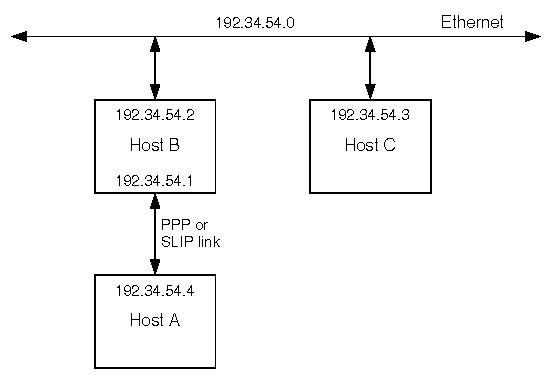 Hosts A and C need to communicate, and the only route is through host B as shown in the figure. The IP addresses that define the link between hosts A and B use the same subnet number as the Ethernet (LAN) (that is, 192.34.54.0) through which hosts B and C communicate. Therefore, host C believes the IP address 192.34.54.4 to have an Ethernet connection on the LAN. When the IP protocol layer of host C receives a packet addressed to 192.34.54.4, host C puts an ARP broadcast on the LAN asking the host of that IP address to respond with its Ethernet address. Because host A is not on the LAN, host C receives no response and believes it cannot communicate with that IP address.