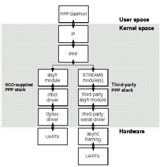 SCO PPP can also support third-party PPP STREAMS stacks for use with smart asynchronous serial port devices that are capable of performing packetization and framing in hardware. Using smart serial port devices has two performance benefits: