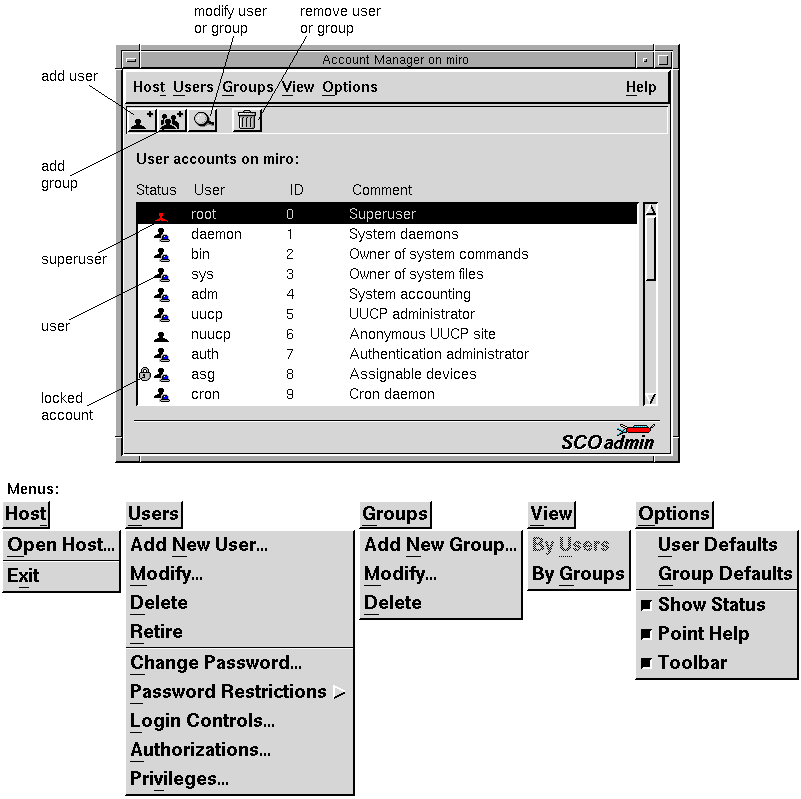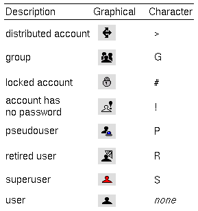 The main display of the Account Manager includes a list of accounts on the system. The icons (or characters) in the ``Status'' column indicate the type of account and its status. By default, the Status information is not displayed to keep startup time to a minimum. To display status information, select Show Status from the Options menu.