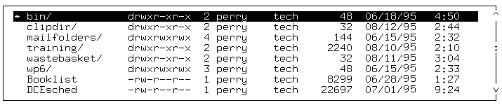In addition to the basic information, the File window has options to select the style of listing, the sort order, and whether to sort the files by date or by name. If you choose a brief style listing, only filenames are displayed; the system style listing gives you a full view of filenames with their corresponding owner and group IDs, permissions, size, and inode change time. The following is an example of a system style listing: