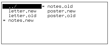 If you need to move up to a directory above yours (as from /u/perry to /u), type the ``<'' character. You can also select the symbol for the next directory up, ``../'' (dot dot slash), that appears at the beginning of every list of directories and files.