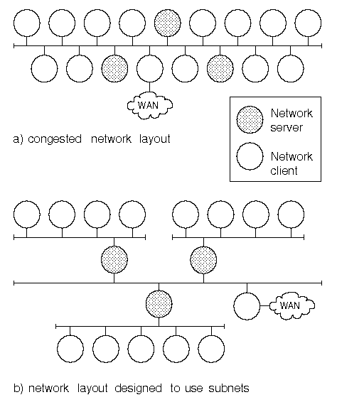 To reduce network loading, consider dividing it into separate networks (subnets) as shown in ``Dividing a network into subnetworks to reduce network traffic''. This diagram shows how a network could be divided into three separate subnets. Routers connect each subnet to a backbone network. This solution only makes sense if you can group clients with individual servers by the function they perform. For example, you could arrange that each subnet corresponds to an existing department or project team within an organization. The clients dependent on each server should live on the same subnet for there to be a gain in network performance. If many machines are clients of more than one server, this layout may actually make the situation worse as it will impose an additional load on the servers acting as routers.