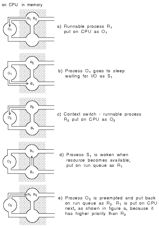 If the process has used up its time slice or is preempted, it is returned to the run queue. If it cannot proceed without access to a resource such as disk I/O, it sleeps until the resource is available. Once access to that resource is available, the process is placed on the run queue before being put on the processor. ``Preemption of a process that goes to sleep waiting for I/O'' illustrates this for a process O[1] which goes to sleep waiting for I/O.