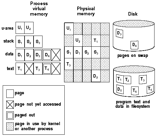 ``How the virtual memory of a process relates to physical memory and disk'' illustrates how a process' virtual memory might correspond to what exists in physical memory, on swap, and in the filesystem. The u-area of a process consists of two 4KB pages (displayed here as U[1] and U[2]) of virtual memory that contain information about the process needed by the system when the process is running. In this example, these pages are shown existing in physical memory. The data pages, D[3] and D[4], are shown as being paged out to the swap area on disk. The text page, T[4], has also been paged out but it is not written to the swap area as it exists in the filesystem. Those pages which have not yet been accessed by the process (D[5], T[2], and T[5]) do not occupy any resources in physical memory or in the swap area.