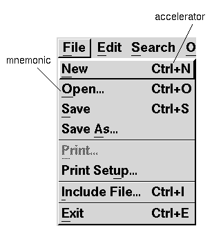 Some frequently used menu items can be selected from the keyboard without opening the menu. Such items are identified by a combination of keys (accelerators) to the right of the menu item. For example, you could enter: <Ctrl>N to select New from the menu above.