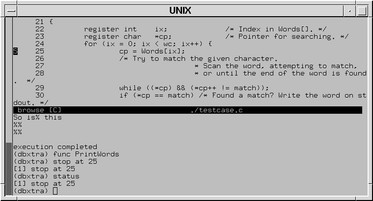 The cp pointer points to the characters in the input buffer. Therefore, the cp pointer might be a place to start searching for the problem. Because we know the cp pointer is used in the PrintWords function from the cxref output, examining the function PrintWords, and monitoring cp, might lead us to discover why testcase is not behaving correctly. At this point, a breakpoint should be set in the PrintWords function. This allows control over the program's execution, enabling us to monitor the cp pointer. The following commands set a breakpoint and check to ensure that breakpoint has been set:
