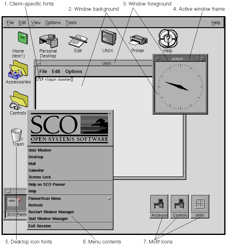 To clarify which configuration files you should use to customize the various aspects of the Graphical Environment, it is useful to look at an active Graphical Environment session. ``Configurable Graphical Environment characteristics - View 1'' and ``Configurable Graphical Environment characteristics - View 2'' show possible screen displays, with annotations that discuss each characteristic and how it is customized.