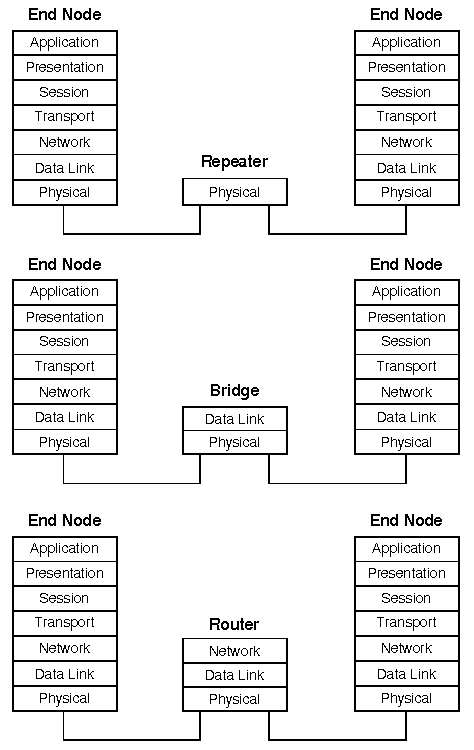 ``OSI Representations of Network Devices'' illustrates the relationship between repeaters, bridges, and routers. Each is described in greater detail in subsequent sections.